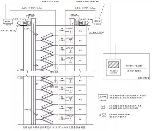 2)楼梯间在约1/4和3/4高度处各设置一台余压探测器;