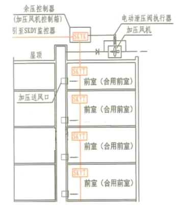 (2)加压。当余压值低于规定区间时,余压传感器将信号传递给余压控制器(箱),余压控制器(箱)联动泄压阀执行器,关闭旁通阀,正压送风管道的风量增大,使消防前室、封闭避难层(间)、防烟楼梯间的余压值上升至正常区间。